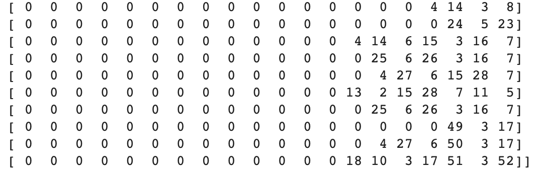 단어의 크기가 저렇게까지 많지 않은데 왜 100이나 해놓은지는 모르겠다 결과를 보니 training_sentences에 존재하는 단어는 52개이다.