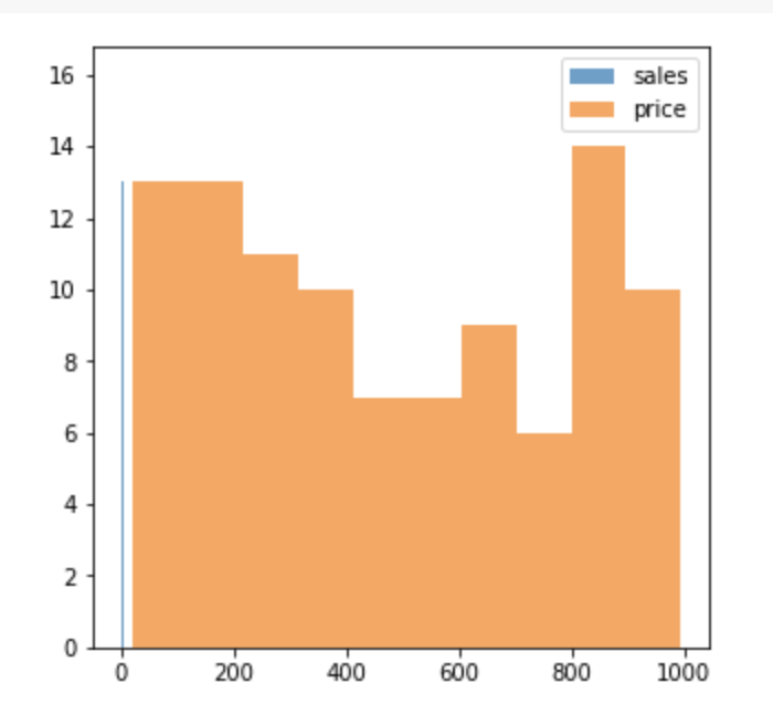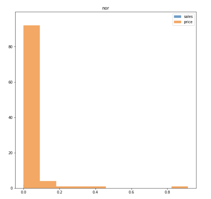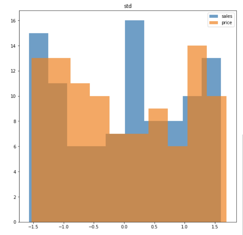 ex ) 최대 - 최소의 범위가 0.04 ~ 3.49인 sales & 최대 - 최소 범위가 22.43 ~ 994.98인 price