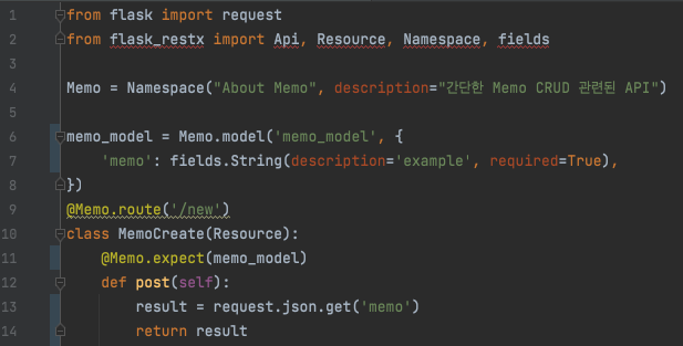 Namespace를 선언하고 나면 Namespace에서 사용할 수 있는 model(데이터 받는 부분)을 만들 수가 있는데 간단하게 문자열을 받기 위해 fields.String을 만들어주었다.
