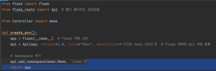 그 밑에 api.add_namespace(memo.Memo, '/memo') 부분은