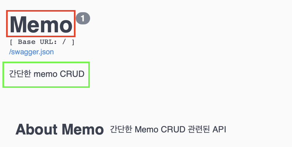 Api에서 title은 빨간 박스 부분에 해당하고 description에는 간단한 API에 대한 설명을 쓰면 된다.