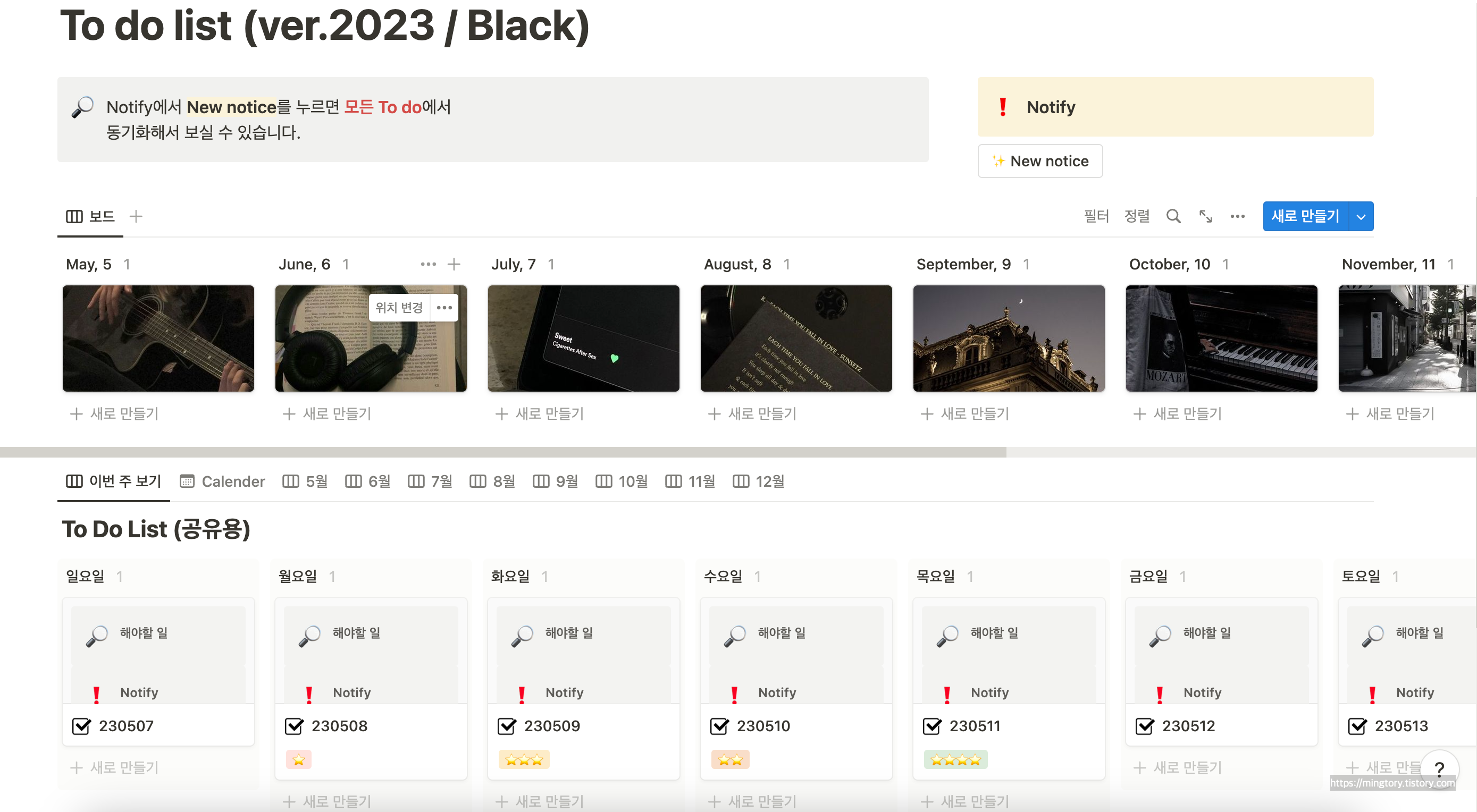 | [Notion/템플릿 공유] 주간 할 일 할 일 몰아보기 (0) | 2023.05.30 |