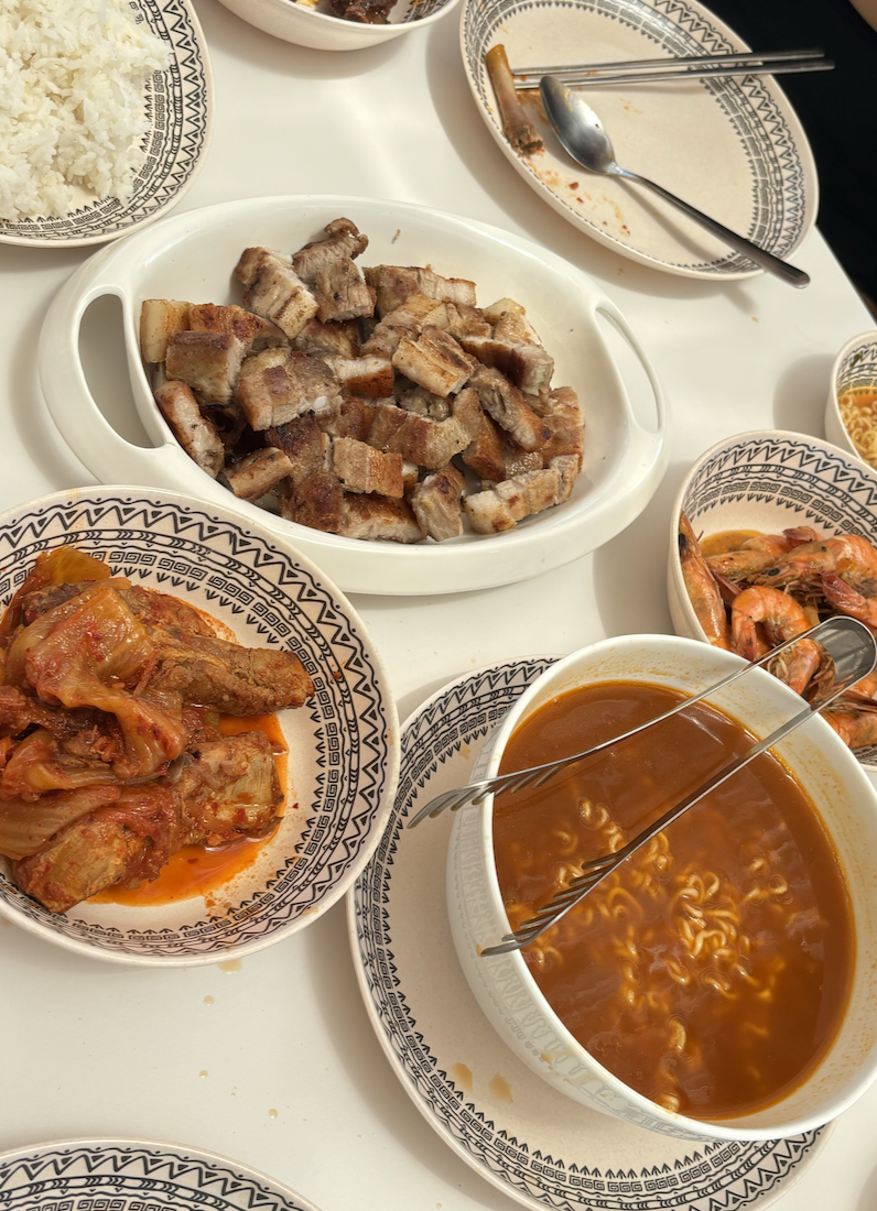 삼겹살에 김치찜에 라면 새우 망고까지 한상 차림 차려줌..