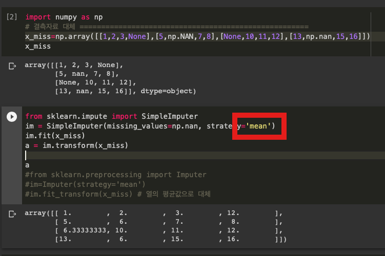 빨간 상자 부분을 바꿔서 평균, 중위수, 최빈수로 바꿀 수 있는데 각각 mean, median, most_frequent로 바꿀 수 있다