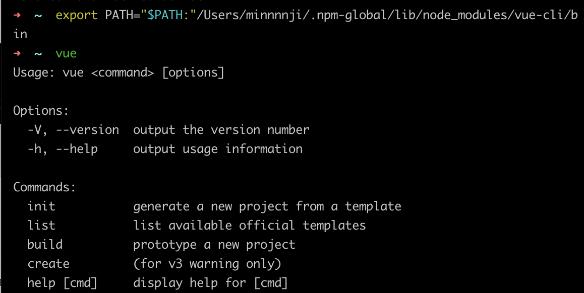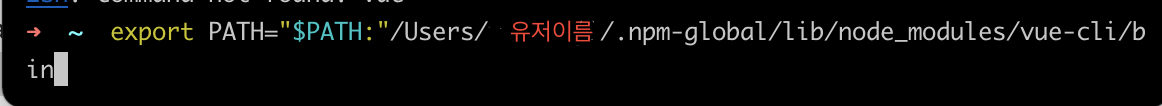 export PATH="$PATH":/Users/유저 이름/.npm-global/lib/node_modules/vue-cli/bin